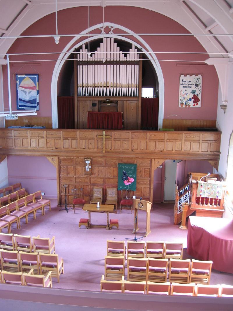 In 1962, major alterations were undertaken, rewiring, better lighting and updating of the kitchen and toilets. By 1975, an upstairs room had been constructed and comfortably furnished, in which smaller meetings can be held. These alterations served well until the 1990s. Some embarrassing moments with coffins having to be upended to get round tight corners in the entrance, heating pipes of enormous diameter and steps in the aisles to trip up the unwary led to the pews being removed, the floor being levelled and carpet being laid throughout.